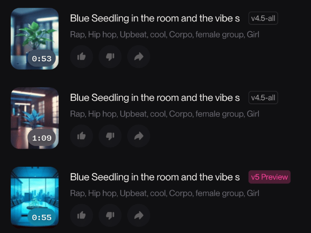 Enter Suno AI, a generative AI music platform. We fed it the script, selected a style (“female rap”), and let it generate a few versions of the song. Some were too slow. Some were too polished. One was just right, slightly chaotic, unmistakably synthetic, but with the perfect beat drop at just the right time.